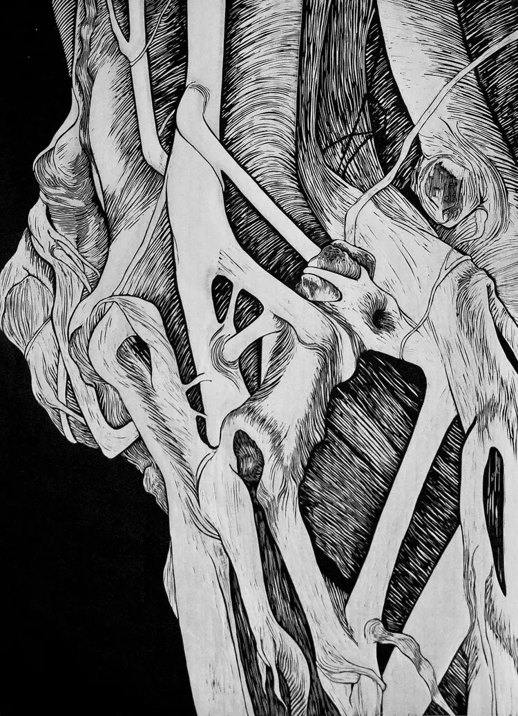 En 2007, elle découvre la gravure : c’est un coup de foudre immédiat. Plus attirée par la gravure “directe”, elle se forme au burin auprès d’André Bongibault à l’atelier de l’Estampe de Chaville, ainsi qu’en gravure ornementale à l’école Boulle. En 2013, lors d’une résidence de gravure à la Guanlan original printmaking base en Chine, elle découvrira la gravure sur bois. Cette technique est encore aujourd’hui un de ses médiums de prédilection.