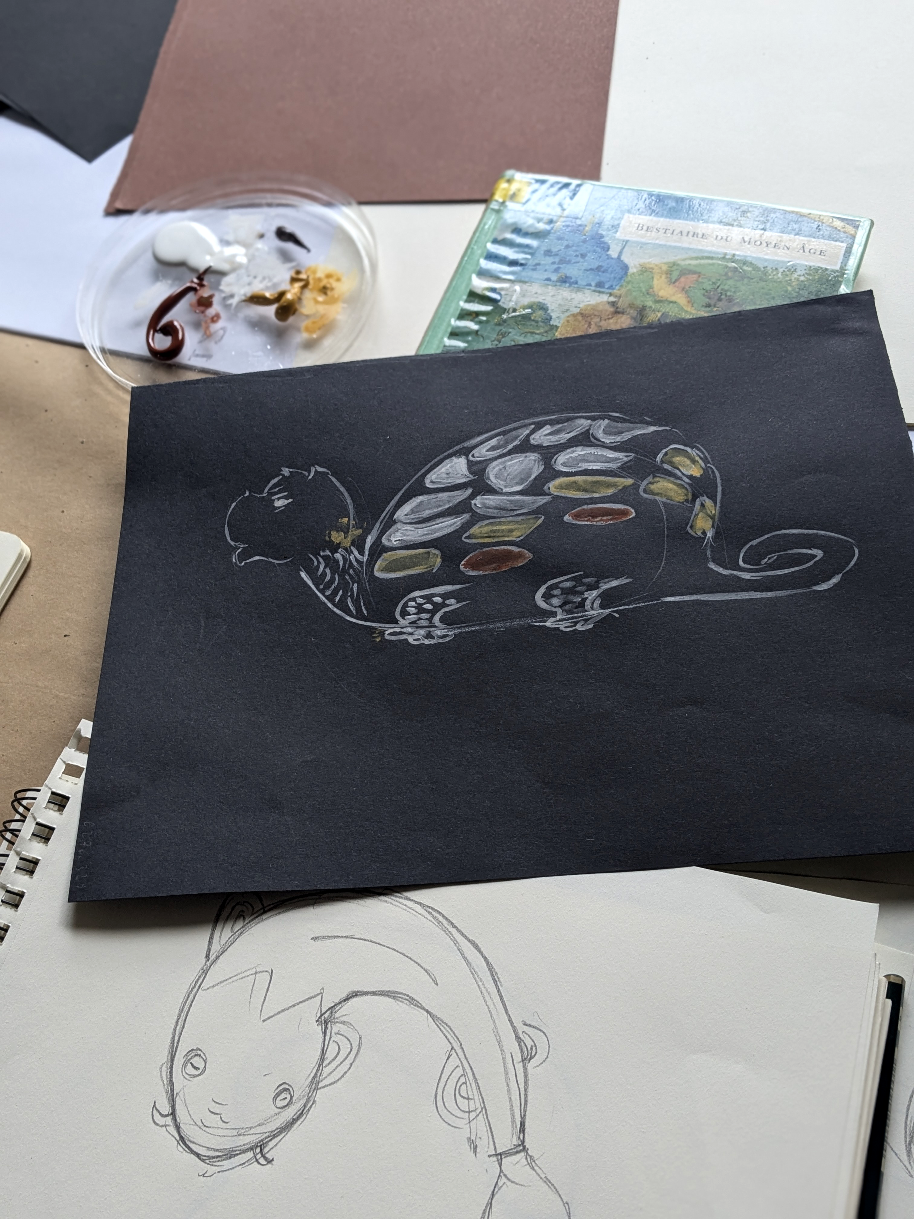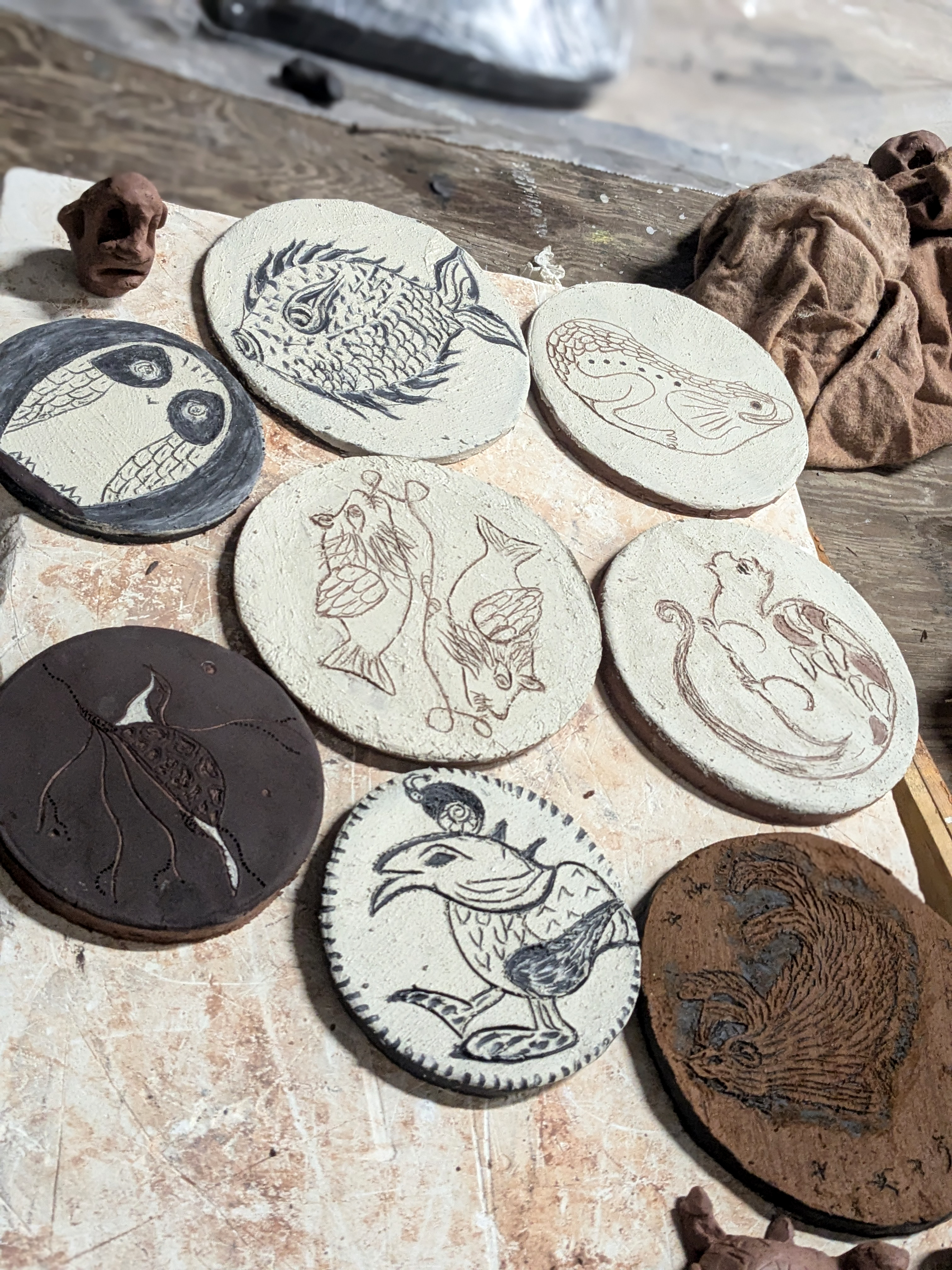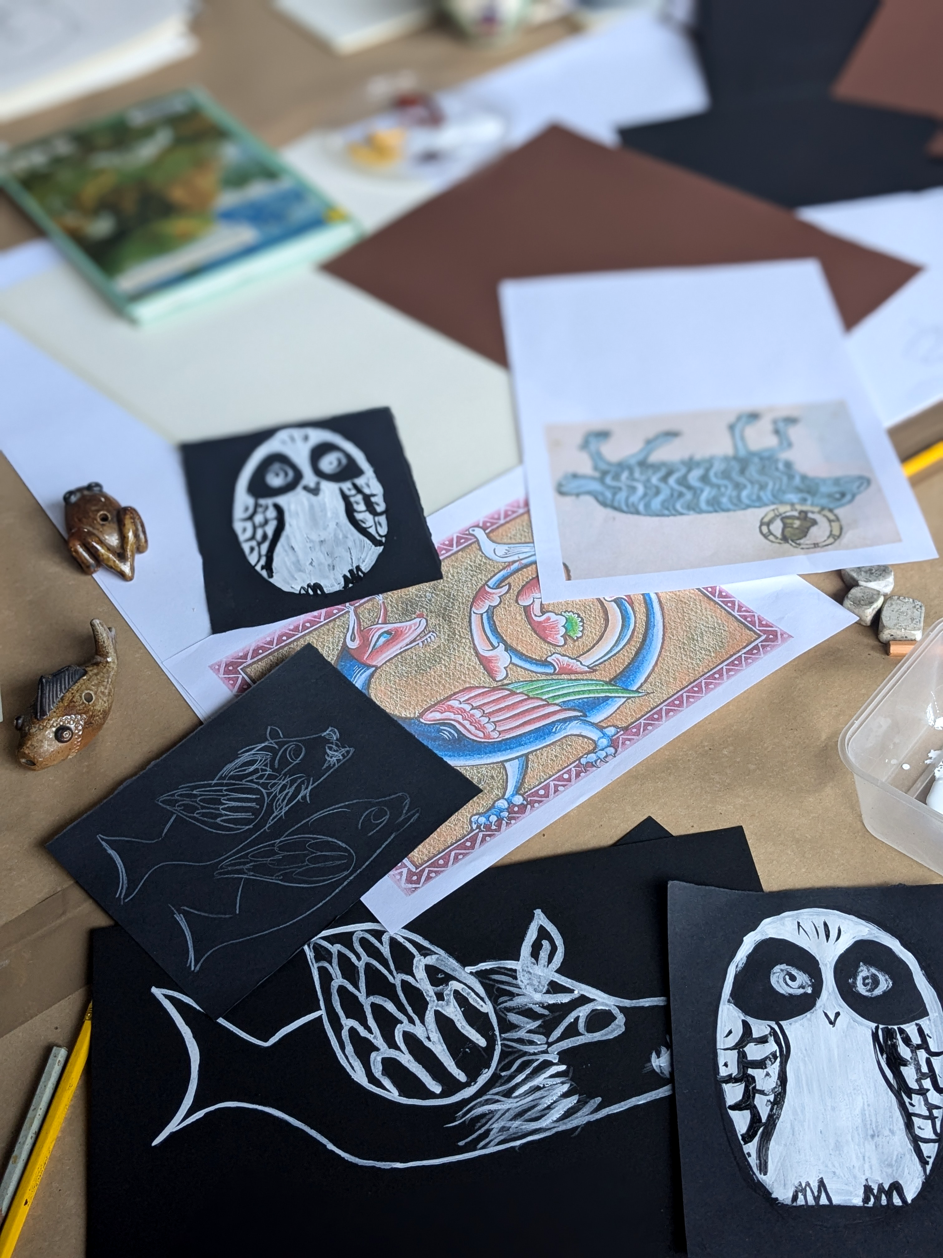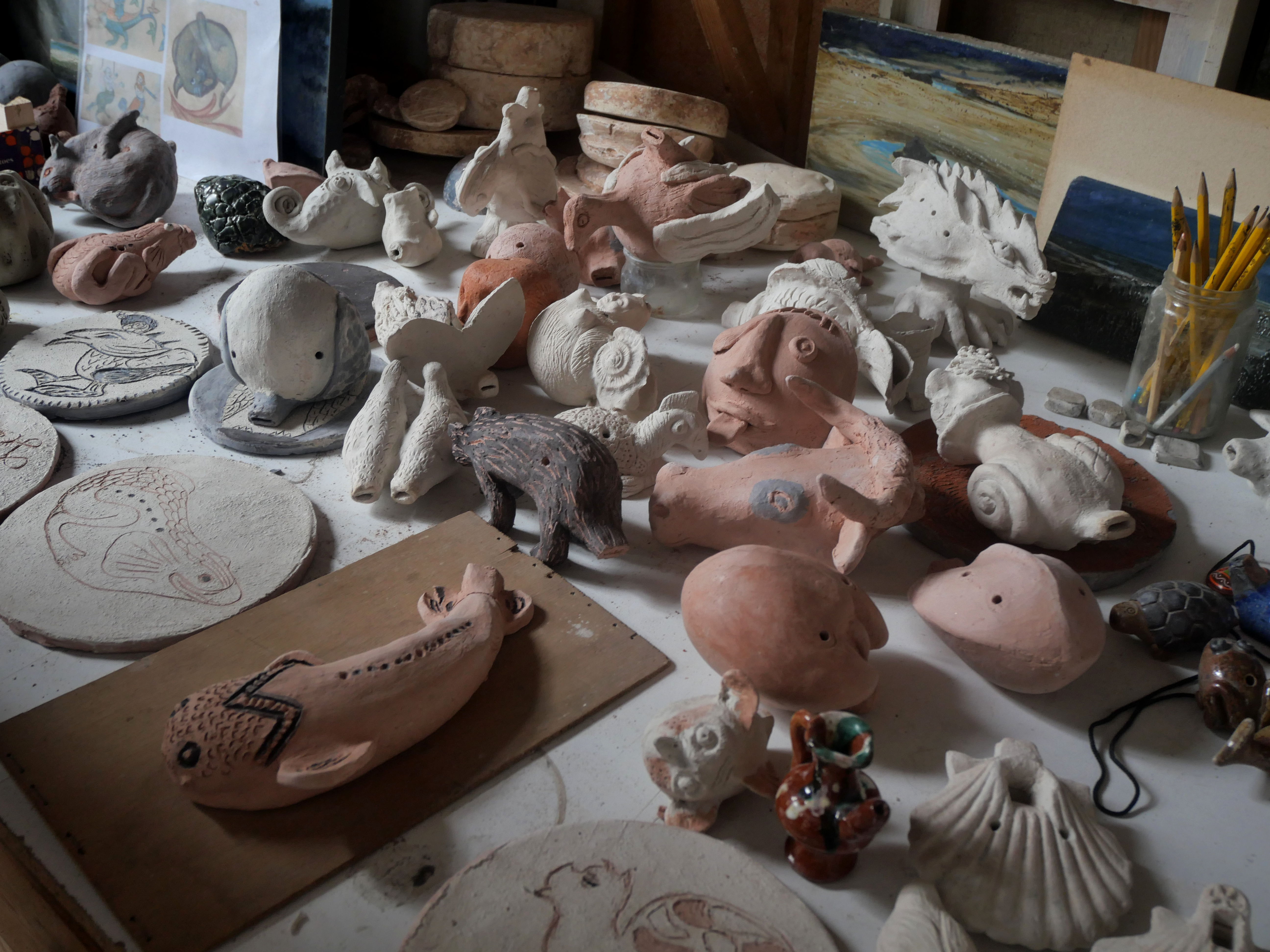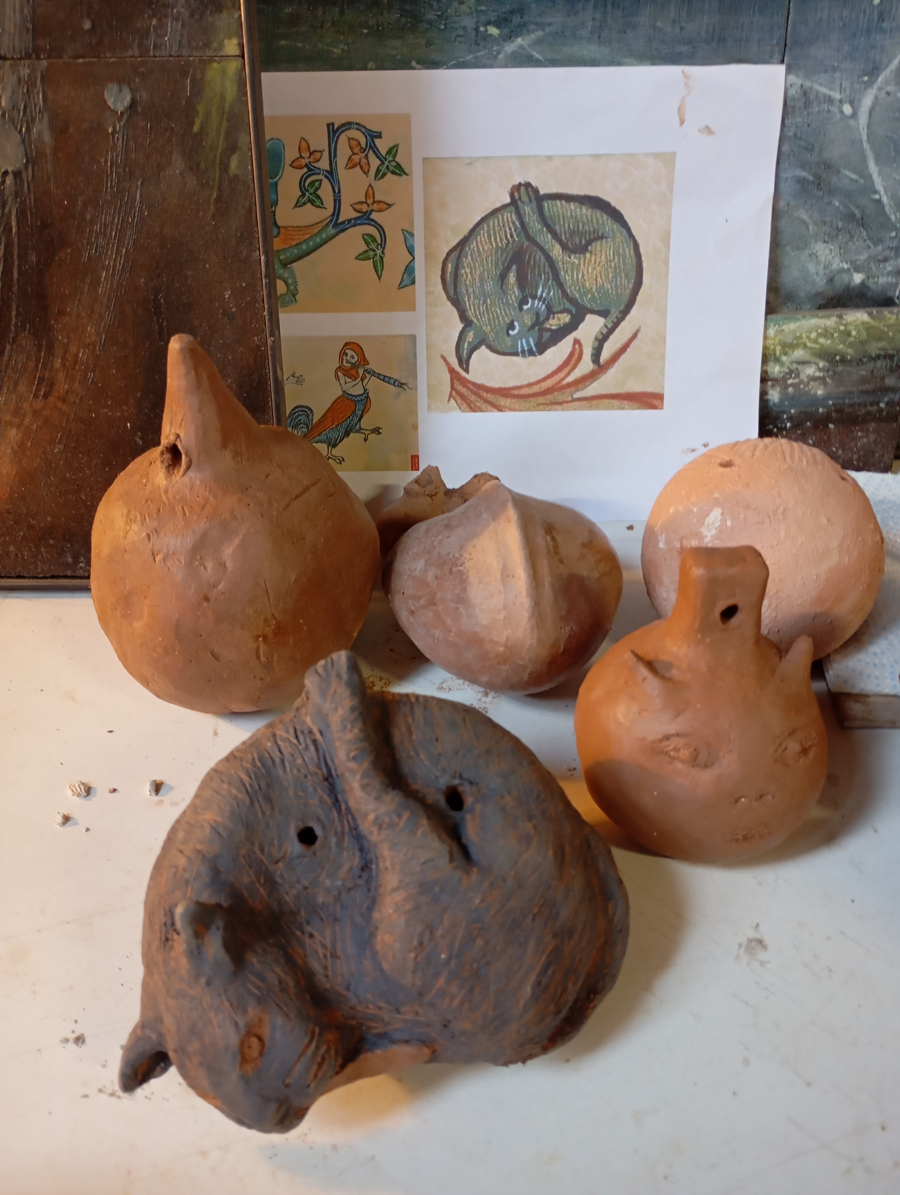 Après une première approche libre par le dessin, à la recherche de texture, d’un vocabulaire graphique propre, chaque participant a pu créer sa propre chimère en s’inspirant de l’iconographie du bestiaire médiéval. Après une représentation sur plaque d’argile, et un apprentissage des différentes techniques inhérente au modelage, chaque participant a su fabriquer son appeau, qu’il a ensuite testé, affiné pour en travailler le son.