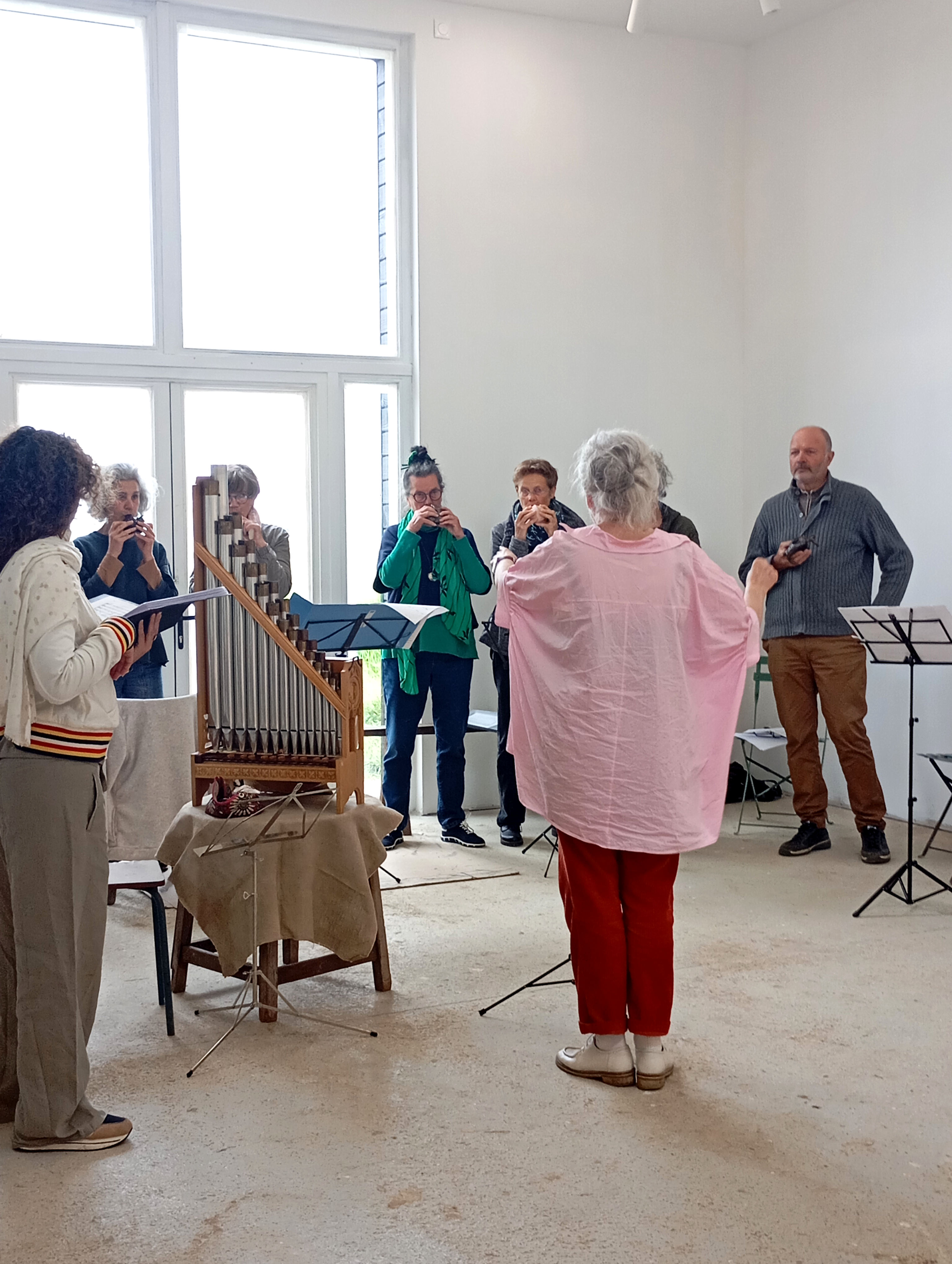Les temps d’ateliers se sont clôturés par la préparation du concert de création avec la présence des chanteuses et du musicien de l’ensemble De Caelis.